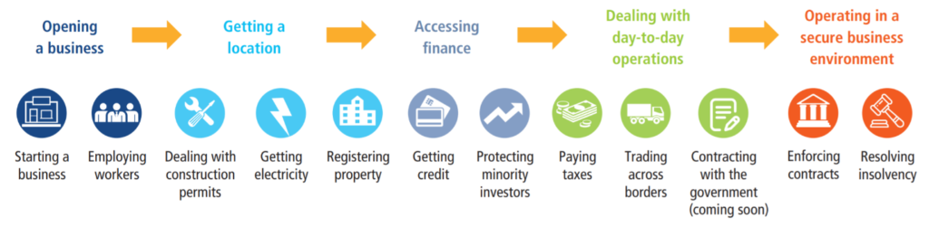 Doing Business presents quantitative indicators on business regulations and the protection of property rights that can be compared across 190 economies globally. The Doing Business Report measures the lifecycle of a business in the following ways:
